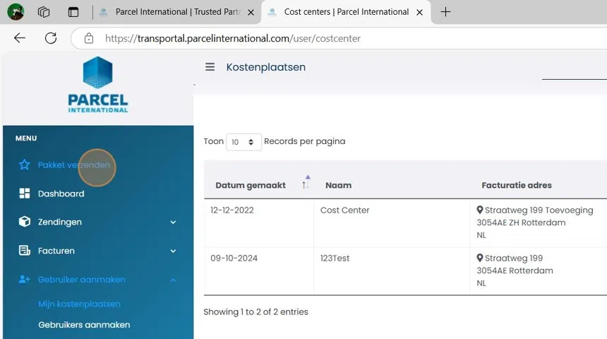 4. Via Pakket verzenden en dan additioneel selecteer de juiste kostenplaats