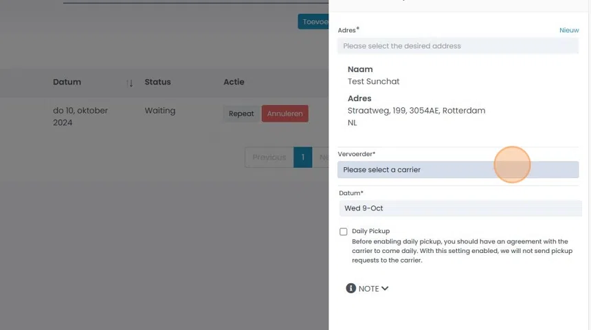 Deze handleiding biedt een stap-voor-stap proces voor het efficiënt beheren van afhaalaanvragen (pickup-requests), voor verschillende vervoerders. Het stroomlijnt het plannen en annuleren van pick-ups en zorgt ervoor dat gebruikers zelf hun pick-ups kunnen beheren en indien noodzakelijk opnieuw kunnen plannen.